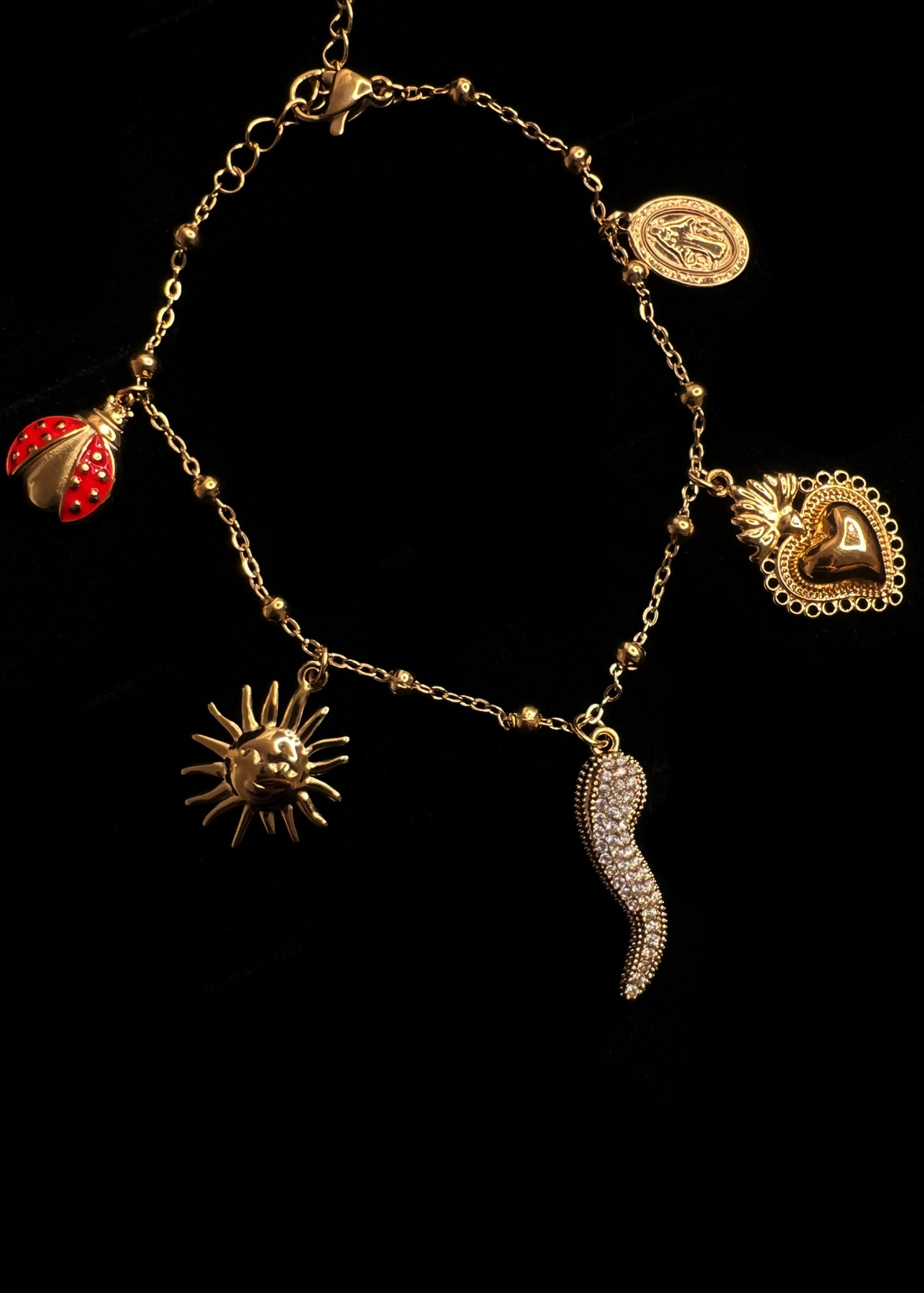 Questo bracciale, ricco di simboli di buona sorte, è un vero talismano da indossare. Su una catena in acciaio inossidabile con piccole perline, sono sospesi pendenti che portano fortuna e protezione: una coccinella smaltata, un sole sorridente, un corno portafortuna tempestato di zirconi, una medaglietta e un cuore sacro. È un gioiello pieno di significato e personalità, disponibile in finitura color argento o oro.