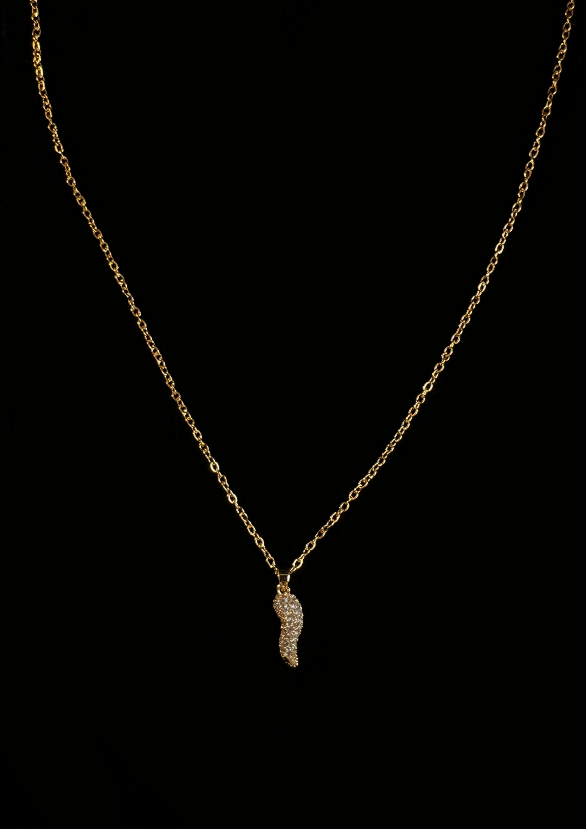 La catenina sottile ed elegante mette in risalto il suo unico ciondolo: un classico corno italiano portafortuna reinventato in una versione luminosa. Il ciondolo è interamente tempestato di file di zirconi bianchi scintillanti, che catturano la luce ad ogni movimento. Questo accessorio unisce la protezione di un simbolo antico all'eleganza moderna, perfetto per ogni giorno o per aggiungere un tocco di luce al tuo look. Disponibile nelle finiture color argento e oro.