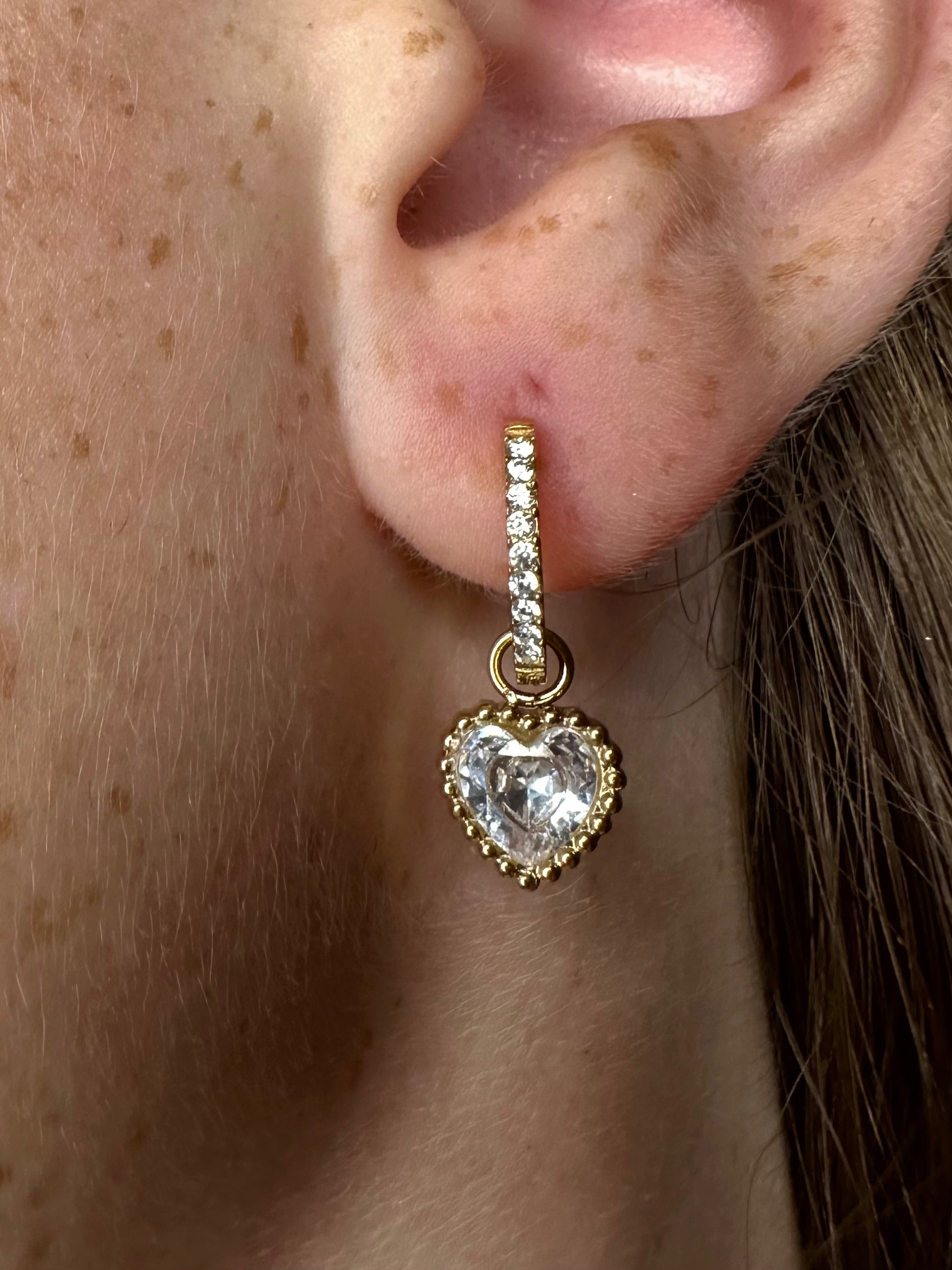 Questi orecchini a cerchio in acciaio inossidabile sono l'accessorio perfetto per aggiungere un tocco romantico e luminoso al tuo viso. Il cerchio è parzialmente impreziosito da zirconi bianchi, da cui pende un grazioso ciondolo a forma di cuore, anch'esso tempestato di un grande zircone centrale e circondato da una cornice luminosa. La pratica chiusura a clip rende questi orecchini facili da indossare e sicuri. Disponibili in finitura color argento o oro.